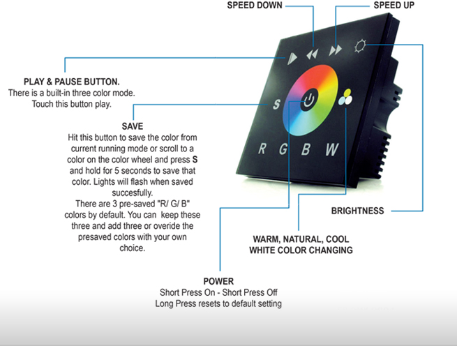 EP-DMX-RGB-2811 DMX full touch panel wall switch is DMX signal output to connect DMX decoders. It is of high sensitive glass touch panel, comes in black or white. Suitable for any RGB or RGBW LED lighting application projects for home, theaters, clubs, restaurants, etc. Can be used with 12/24V LED lights such as LED strip light, LED underwater lights and LED in-ground lights via RGB-DMX Decoder series (sold seperately).