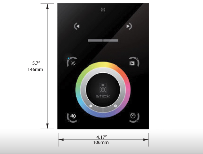 The feature rich lighting controller has been designed to provide a control solution for the most demanding of projects, while maintaining an easy to use panel of touch sensitive buttons. The controller integrates a graphic color screen allowing scene photos to be displayed. Easily view the selected zone, scene name and design without the need to navigate through complex menus. Change the speed, color and dimmer using the circular palette. The lighting levels, color and effects can be programmed from a PC, Mac, Android, iPad or iPhone using the included software.