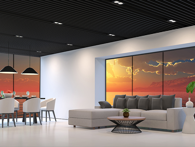 Make any blank wall a view into your dream space. High quality illuminated scenery with stunning panoramic views can be controlled to emulate morning, afternoon and twilight. Options are endless. Give us a call to discuss how we can help you transform your space.