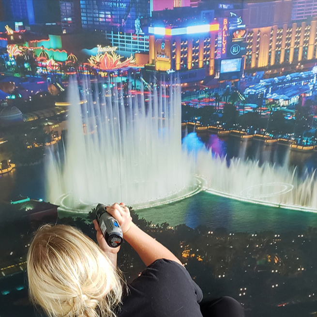 We were given the freedom by one of our favorite resort home designers, Karen Woodward, to take this Las Vegas Mural that was 10ft x 7ft in size , and "Bring it to Life"!" Karen created a large reverse shadow box that became the murals surface and the back housed the custom electronics behind the scenes creating this spectacular art piece. An amazing image that inspired twinkling building and street lights and animated features like the bellagio fountain and the ferris wheel. The homeowners were so excited saying it was the coolest feature in the entire 6 bedroom luxury vacation home. Our creativity is overflowing and never ending.